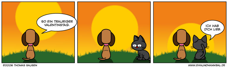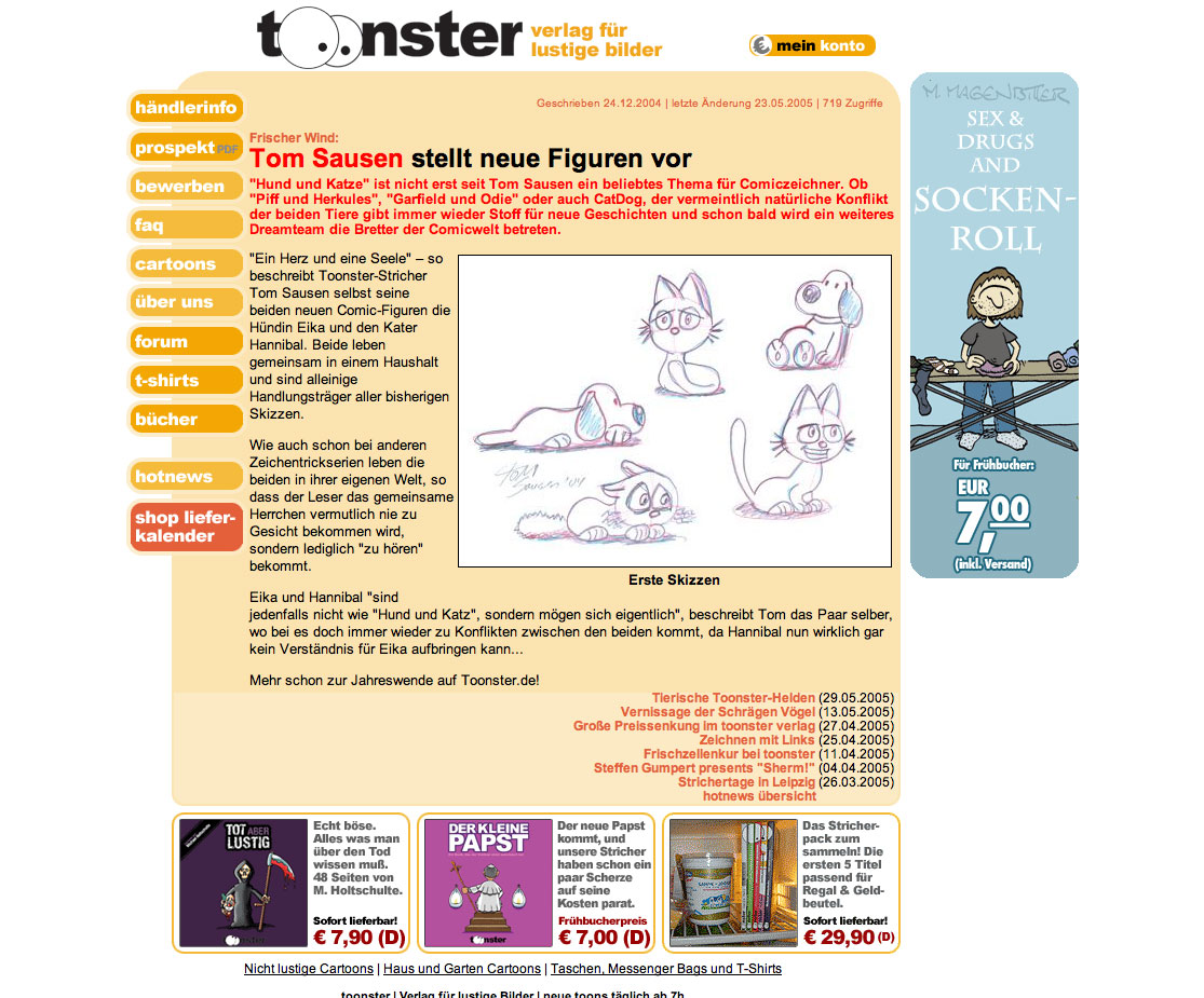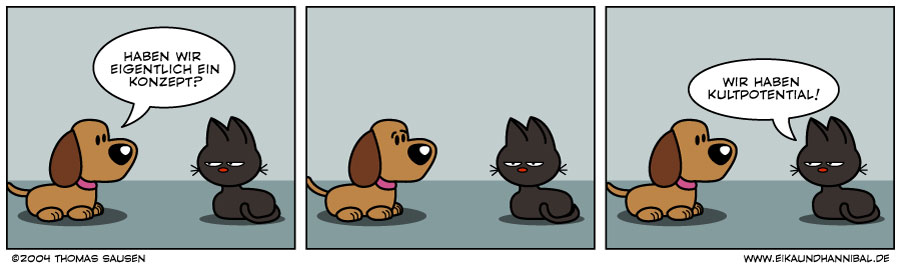 Ich hatte früher mit "Eika und Hannibal" eine Webcomicserie. Diese wurde primär auf der eigenen Website veröffentlicht. Dann noch in einem PDF-Magazin und auf Splashcomics. Außerdem hatten die Charaktere Gastauftritte im Buch "Ganz großes Kino" von den Toonlight Comics. Einigen Leuten gefiel die Serie, auch wenn nur ca. 80-100 Comicstrips veröffentlicht wurden. Dies ist aber schon Jahre her. Wenn ich mich richtig erinnere, wurden nur von 2005 bis 2007 regelmäßig Folgen veröffentlicht. Danach nur noch sehr sporadisch. Versuche die Serie fortzusetzen, gab es immer wieder mal und auch entsprechende Ankündigungen. Selbst heute werde ich (selten) auf die Sache angesprochen. In meinem Portfolio zeige ich die Charaktere aber noch heute gerne umher... sie sind schon so etwas wie ein Markenzeichen von mir.