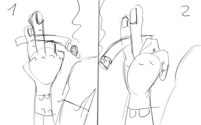 2. So würde ich es machen, dass die ganze Hand inklusive Finger und Kippe nach außen zeigt.