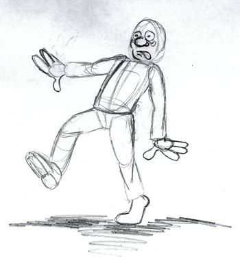 Vorschlag: Nehmt diesen Figurenaufbau zur Grundlage und versucht, weitere Gangarten darzustellen (z.B. schleichend, flüchtend, marschierend,sich vorsichtig vortastend... ) Arbeitet dabei mit dem ganzen Körper. Auch die Haltung der Arme unterstützt eine gehende Haltung.