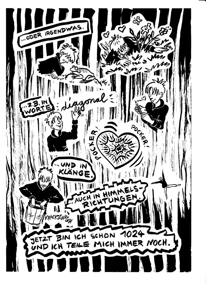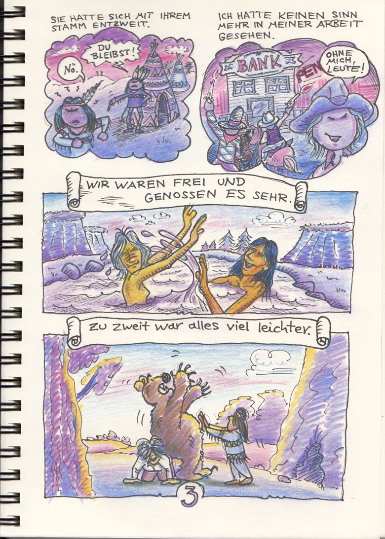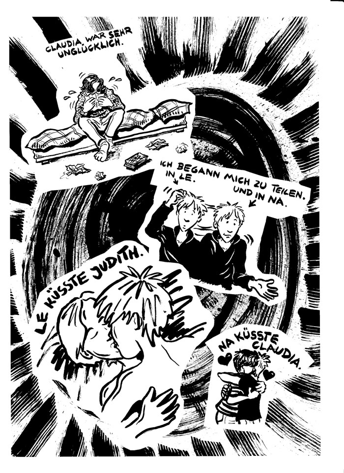 Die Ausgangslage war genau das, was ich da am Anfang beschreibe. Bin jetzt nicht so die Herzensbrecherin. Das ist mir so einmal im Leben passiert. Meine Sicht auf die Situation wurde auch dadurch beeinflusst, dass ich mich damals auf einem „ganzheitlich spirituellen Weg“ wähnte, und dazu gehört wohl, dass man allem, was einem passiert, irgendeinen höheren Sinn, irgendeine Beziehung zu etwas Größerem oder einfach nur Ausuferndem geben möchte. Aber so ein „höherer“ Sinn war da nicht. Ich wollte einfach Erfahrungen machen und keine Entscheidung treffen müssen. Besser gesagt, ich habe mich dafür entschieden, es einfach laufen zu lassen, obwohl ich schon Schiss hatte, am Ende beide Frauen zu verlieren. Nach ca. 2 Jahren war ich auch wieder allein. Der Comic ist aber entstanden, als ich noch mitten in dem völlig neuen, mächtig bedrohlichen Liebes- und Eifersuchtschaos steckte. Naja, und wenn man dann die große Sehnsucht nach Einheitserfahrung (also auch die, dass mal alle Einzelerfahrungen und menschlichen Beziehungen im Leben aufeinander bezogen sind) und das Gefühl, eher so in verschiedene Richtungen auseinanderzudriften, in einen Comic packen möchte, kommt z.B. so etwas dabei heraus.