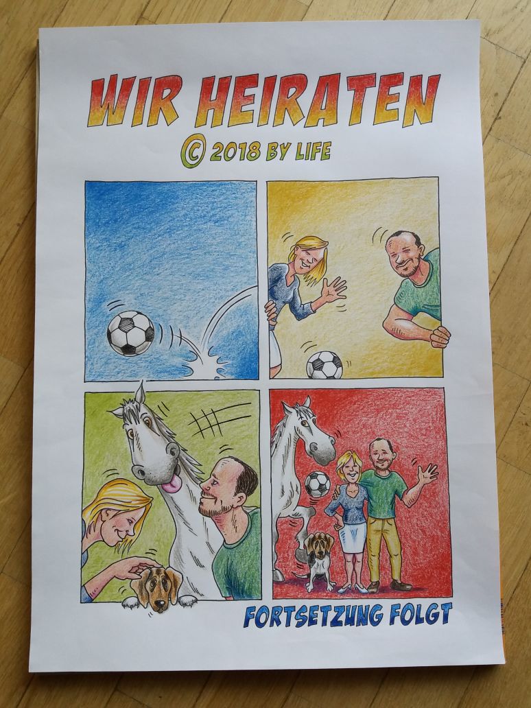 Soll was für die Einladung zu einer Hochzeit zeichnen. Hund, Pferd und Fußball müssen mit drauf. Ansonsten habe ich freie Hand.