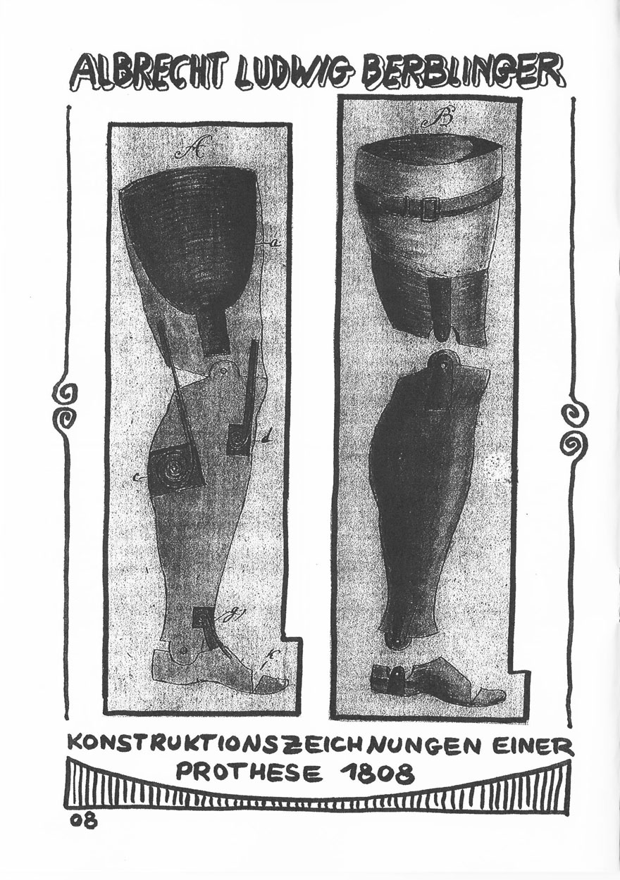 Innen sieht das Heft dann doch etwas sparsamer aus, als das Cover verspricht. Einen "orthopädischen" Comic gibt es, aber den kennt ihr schon. Das ist nämlich "Unter euren Füßen das Grauen" / Teil 1. Die Seiten des Mini-Zines ließen sich sehr schön auf eine Doppelseite dieses A5-Zines montieren. Das Ganze ist dann doch mehr bierzeitungsmäßig mit Text und geklauten Fotos gestaltet. Der Text über Berblinger ist - natürlich ungefragt - einem Ausstellungskatalog entnommen. Will ich deshalb hier auch nicht veröffentlichen.