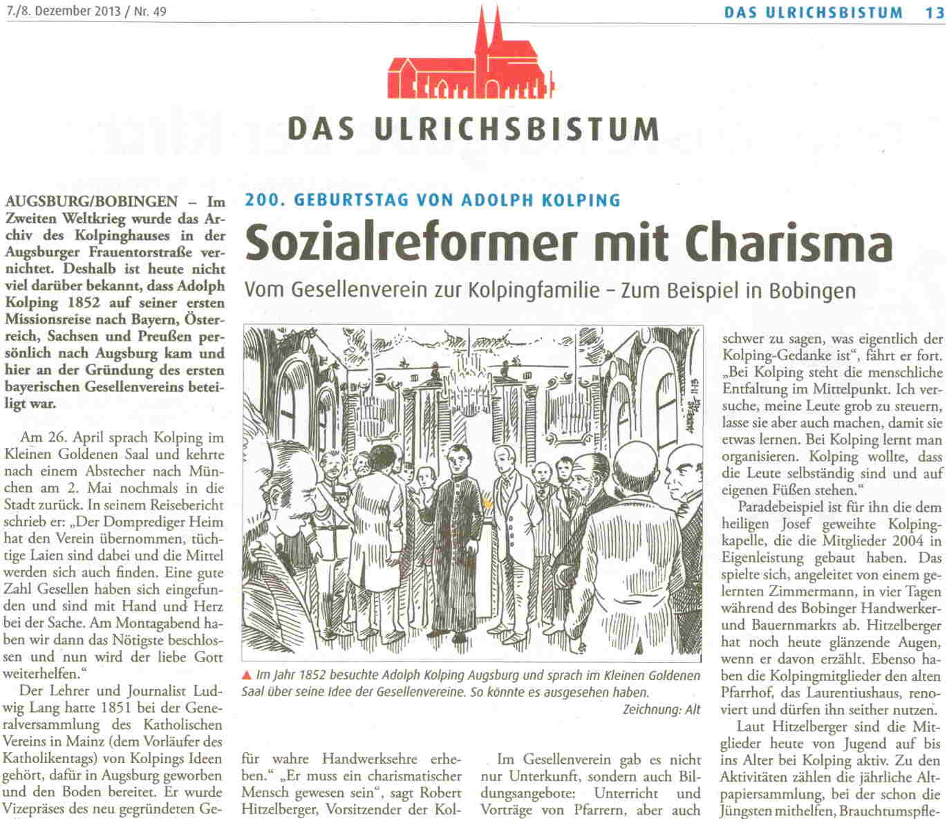 Ich habe gerade eine Würdigung zum 200. Geburtstag von Adolph Kolping geschrieben - das war ein Kölner Pfarrer und Sozialreformer. Es stellte sich heraus, daß er in unserer Stadt war und einen Kolping-Verein gegründet hat, aber es dazu keinerlei Bilder gab. Es war 1852, Fotografie war noch nicht so üblich, und irgendwas Grafisches gab es auch nicht. Also hab' ich mir überlegt, selbst eine Zeichnung von seinem Auftritt im Stadtsaal zu machen. Der Saal sieht wirklich so ähnlich aus; die Leute sind alle von mir erfunden, ihre Kleidung und Frisuren sind aber so etwa zeitgemäß.