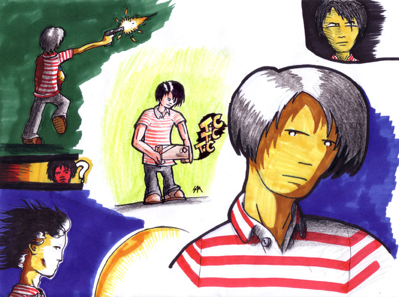 dass er rumschießt will ich eigentlich nicht in einem COmic sehen.. Ich würde sehen wollen, wie er sich bei Mädchen zum Affen macht und solche Sachen.. Du kannst ja für jedes Abenteuer ein Paar Seite machen und als abgeschlossenen Geschichten "verkaufen", also hier veröffentlichen..Das fänd ich gut. Aber wie einer schießt kann ich in jeden 2.klassigem Spiel sehen.