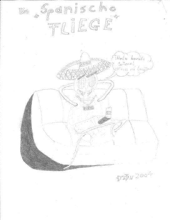 Wirklich schwer zu erkennen. Die Augen würde ich eher wie bei den Insekten in Facettenmuster zeichnen oder dunkler. Aber sonst nicht schlecht. Das einzige, was ich in der Sprechblase sehen kann, ist spanische Begrüßung, aber den Schluß nicht.