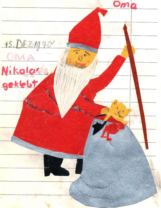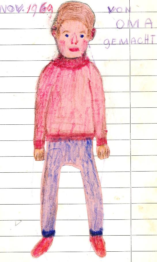 Es gibt ein Kalenderbuch, das wir immer zum Aufbewahren unserer Werke benutzt haben. Ich weiß noch, daß ich anfangs immer sagte: "Oma, spiel!" Dann hat sie für mich Sterne gefaltet, Muster gestaltet oder solche Figuren ausgeschnitten. Wenn man in dem Buch blättert, stellt man fest, daß die Oma-Werke nach und nach weniger werden und immer mehr Zeichnungen von mir auftauchen. Ich habe lieber mit Bleistift oder Filzstift gearbeitet. Das heißt, zunächst habe ich auch Figuren aus der Fernsehzeitschrift ausgeschnitten und aufgeklebt (meistens Cowboys), dann habe ich angefangen, selbst Cowboys zu zeichnen, und dann kommen zunehmend Comicfiguren, die ich durchgepaust oder nachgezeichnet habe.