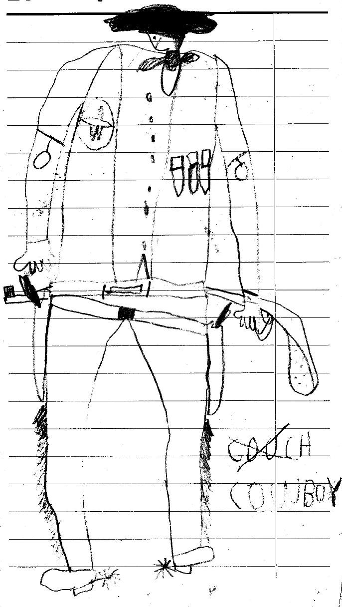 Danke für die Anmerkungen, Rosa. Der kleine Kopf rührt sicher daher, daß die Seite oben zuende war. Manches kann ich heute nicht mehr deuten, vor allem diese runden Dinger, die von den kurzen Ärmeln herabbaumeln. In der Weste stecken drei Patronen, das weiß ich noch - habe ich irgendwo so gesehen. Auch die fransenbesetzte Hose - die kann allerdings von Indianern abstammen.