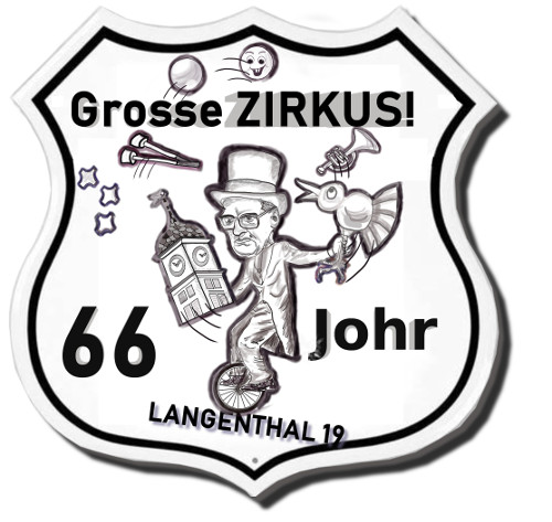 Gut gezeichnet, aber ich gebe Plopmann Recht: Im Ganzen zu viel, zu unübersichtlich. Man könnte auf die Wappenform verzichten und stattdessen den Text "66 Jahre Grosse(r) Zirkus Langenthal 19" in Kreisform um den Einradfahrer setzen, und zwar vom Rad unten links beginnend einmal drum herum bis an den rechten Einrad-Rand.