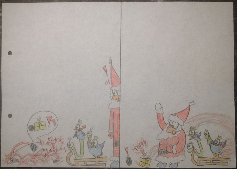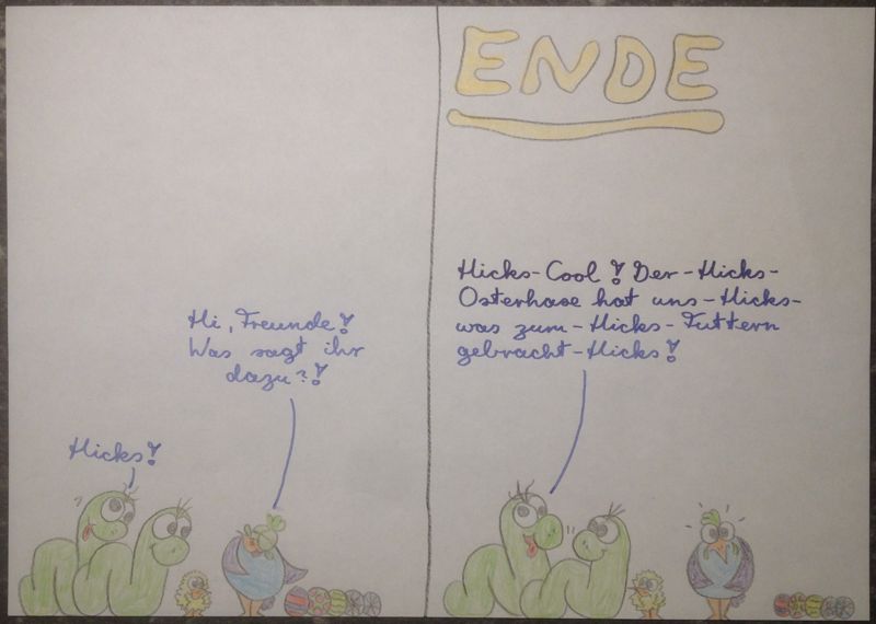 "Schlusspointen" waren in der Phase noch so Happy-End-mäßig wie in Bild 4.. Bis die (zu der Zeit noch schnuckelige Schulschreib-)Schrift meine Möglichkeiten erweiterte. Bild 5 zeigt, was ich meine. (Zur Erklärung: Gluckie legte damals gern bunte Eier. Das erste, blaukarierte stammt auch von ihr.)