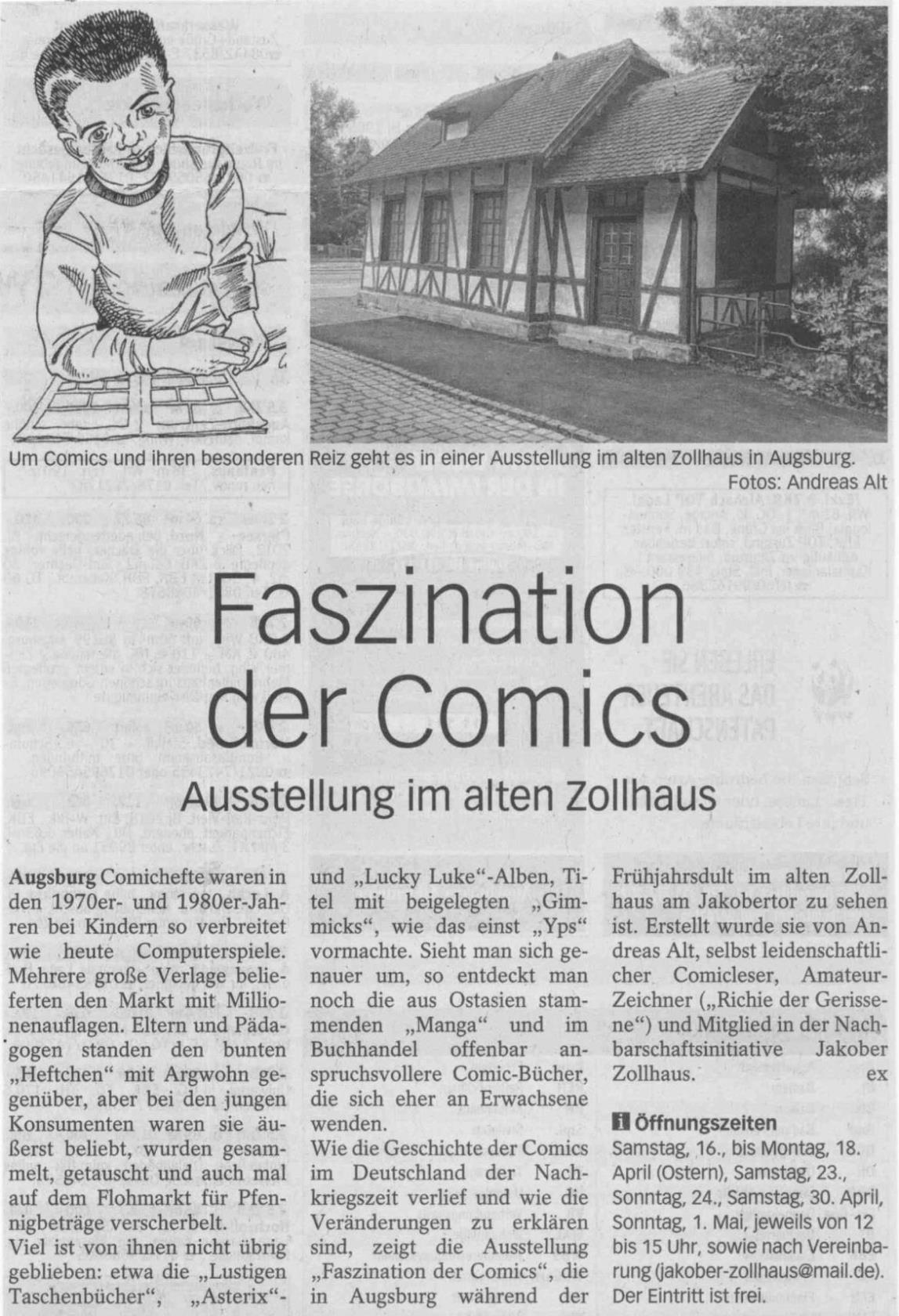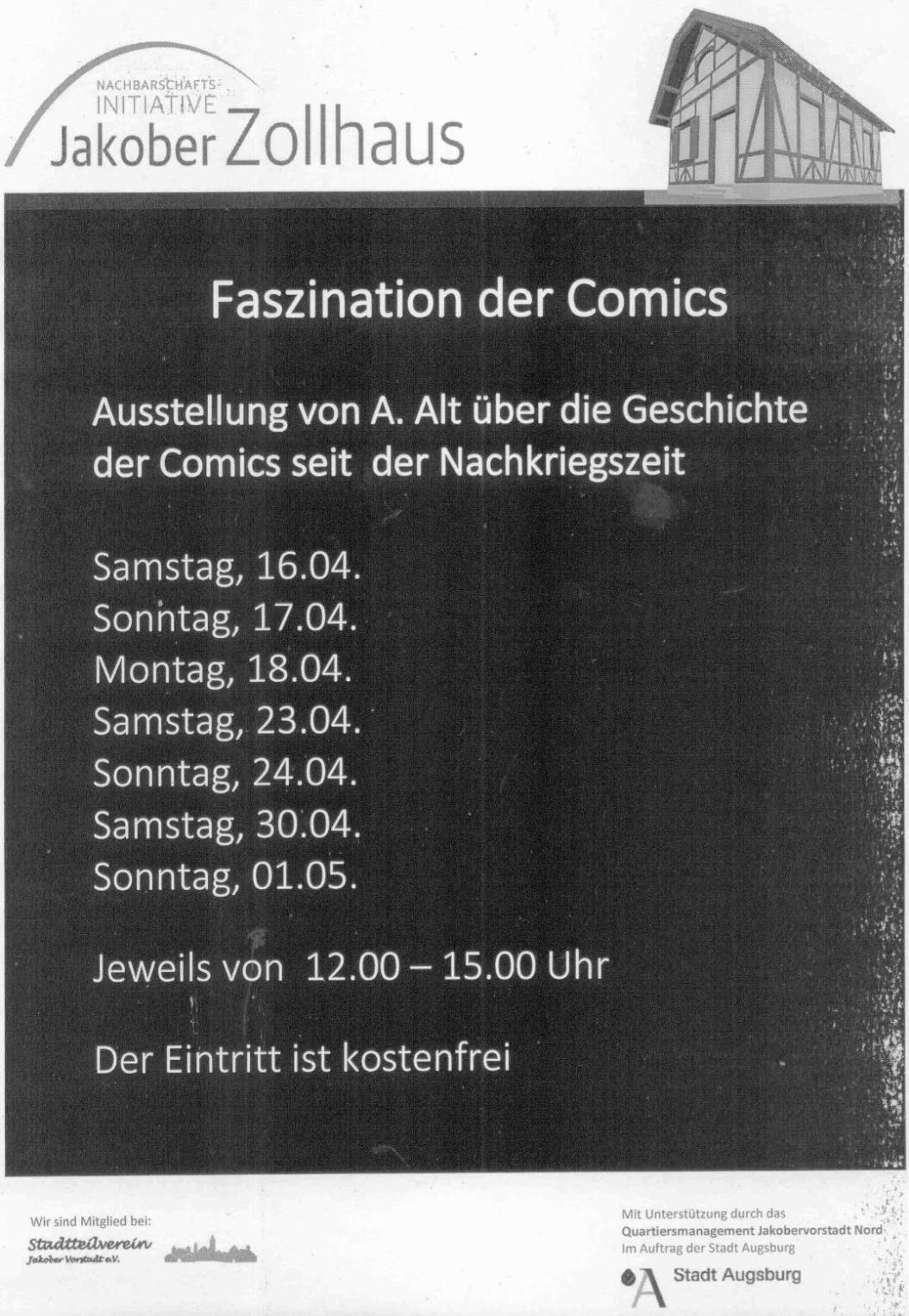 [font='"']Wie die Geschichte der Comics im Deutschland der Nachkriegszeit verlief und wie die Veränderungen zu erklären sind, zeigt die Ausstellung „Faszination der Comics“, die während der Frühjahrsdult im alten Zollhaus am Jakobertor zu sehen ist. Erstellt wurde sie von Andreas Alt, selbst leidenschaftlicher Comicleser, Amateur-Zeichner („Richie der Gerissene“) und Mitglied in der Nachbarschaftsinitiative Jakober Zollhaus. Die Öffnungszeiten sind von Samstag, 16. April, bis Montag, 18. April (Ostern), Samstag, 23. April, Sonntag, 24. April, Samstag, 30. April, und Sonntag, 1. Mai, jeweils von 12 bis 15 Uhr, sowie nach Vereinbarung ([/font][font='"']jakober-zollhaus@mail.de[/font][font='"'])[/font][font='"']. Der Eintritt ist frei.[/font]