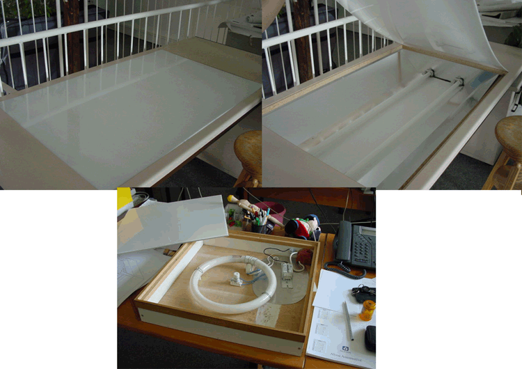 So, jetzt habe ich ma den Leuchtisch ausse Firma geknipst. Von innen und außen. Und noch meinen Selbstgebauten von innen.
