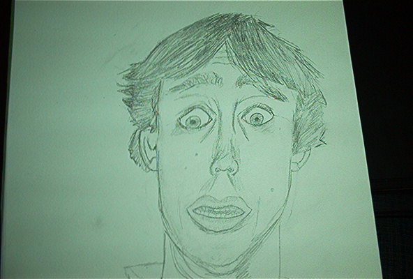 Willkommen im Club! Für eine 10-Minuten-Zeichnung schon echt klasse! O.K. manche Proportionen stimmen nicht so hundertprozentig (an der Nase scheint der Schönheitschirurg von Michael Jackson beteiligt gewesen zu sein...), aber den erschreckten Gesichtsausdruck hast du prima hinbekommen! Als Betrachter fragt man sich, was der Bursche wohl gerade erblickt haben mag: einen Horrorfilm, ein Aktfoto von Angela Merkel oder ob er nur gerade über dem Hartz IV-Fragebogen sitzt?! Fragen über Fragen...