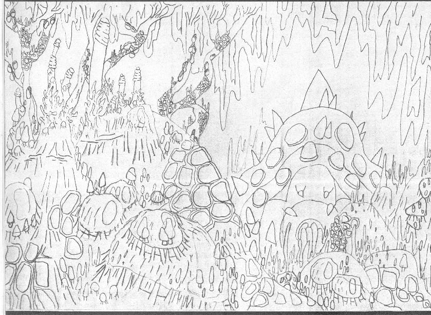 Ich hab mich mal an einem Hintergrund versucht, etwas inspiriert vom einem alten Anime. Wenn ich jetzt noch gut kolorieren könnte... Denkt euch einfach eine düstere und giftige Stimmung dazu. :)